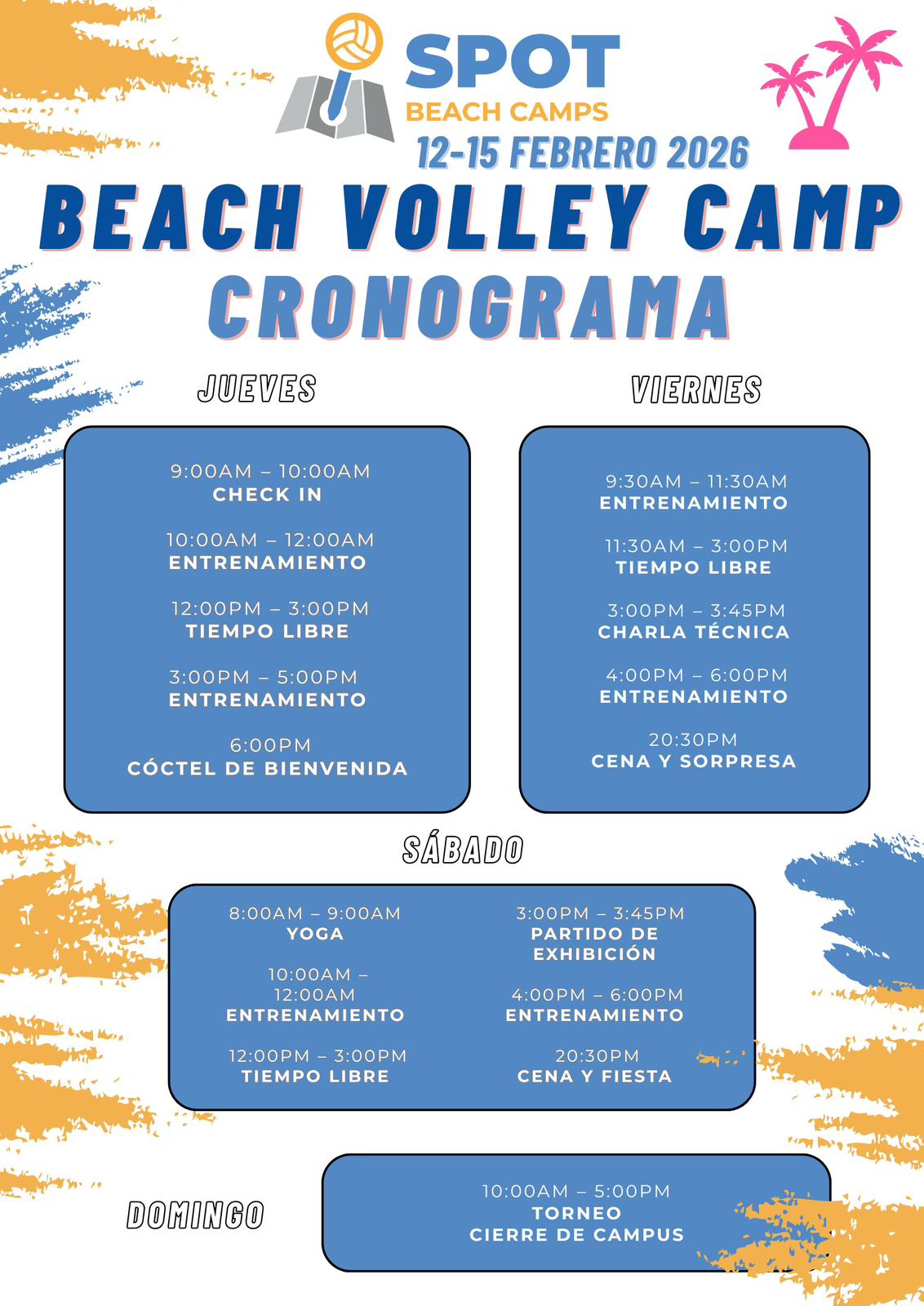 Spot Beach Camps es un grupo nacional e internacional de campamentos de voleibol playa fundado por Hernán Tovar, jugador profesional de Venezuela. Nuestro objetivo es crear experiencias deportivas únicas con entrenadores de primer nivel en un ambiente divertido y multicultural.